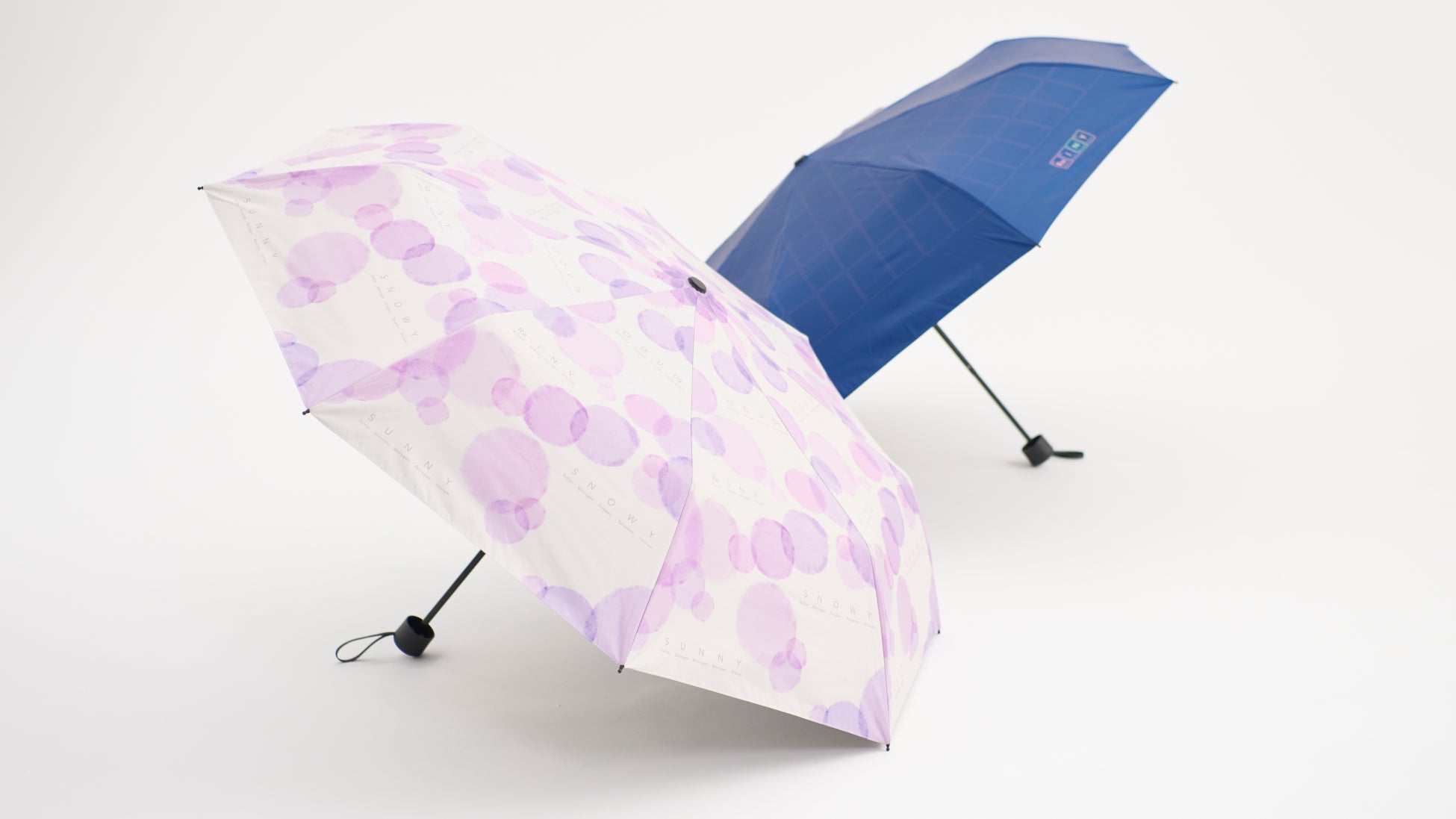 今回新たに発売するのは、晴雨兼用の折り畳み傘。優しげなパープルの水玉模様が可愛らしい「水彩」と、落ち着いたカラーで使いやすい「ネイビー」の2種展開です。