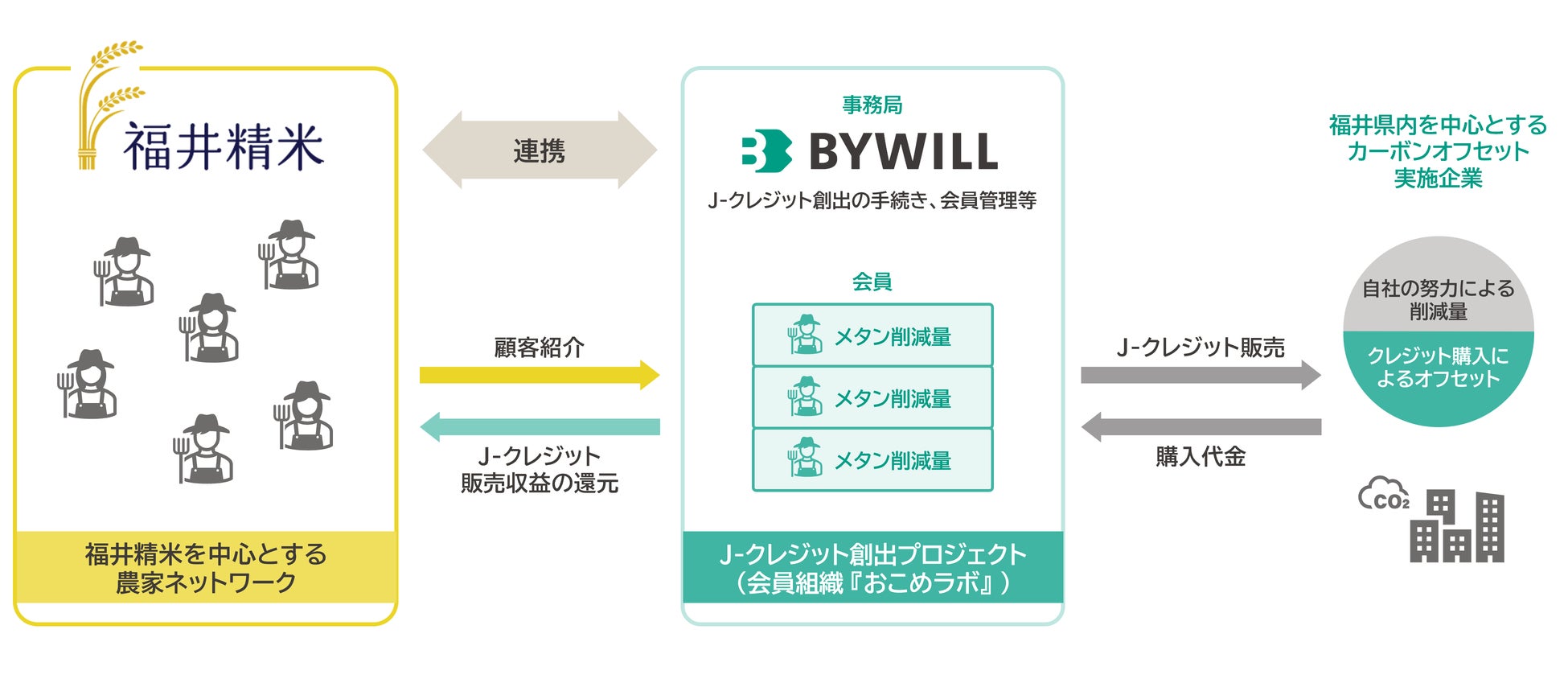 福井精米は、バイウィルが運営する「水稲栽培における中干し期間延長」によるJ-クレジット創出プロジェクト(会員組織名「おこめラボ」)に関して、ニーズを有する取引先農家をバイウィルに紹介する役割を担います。