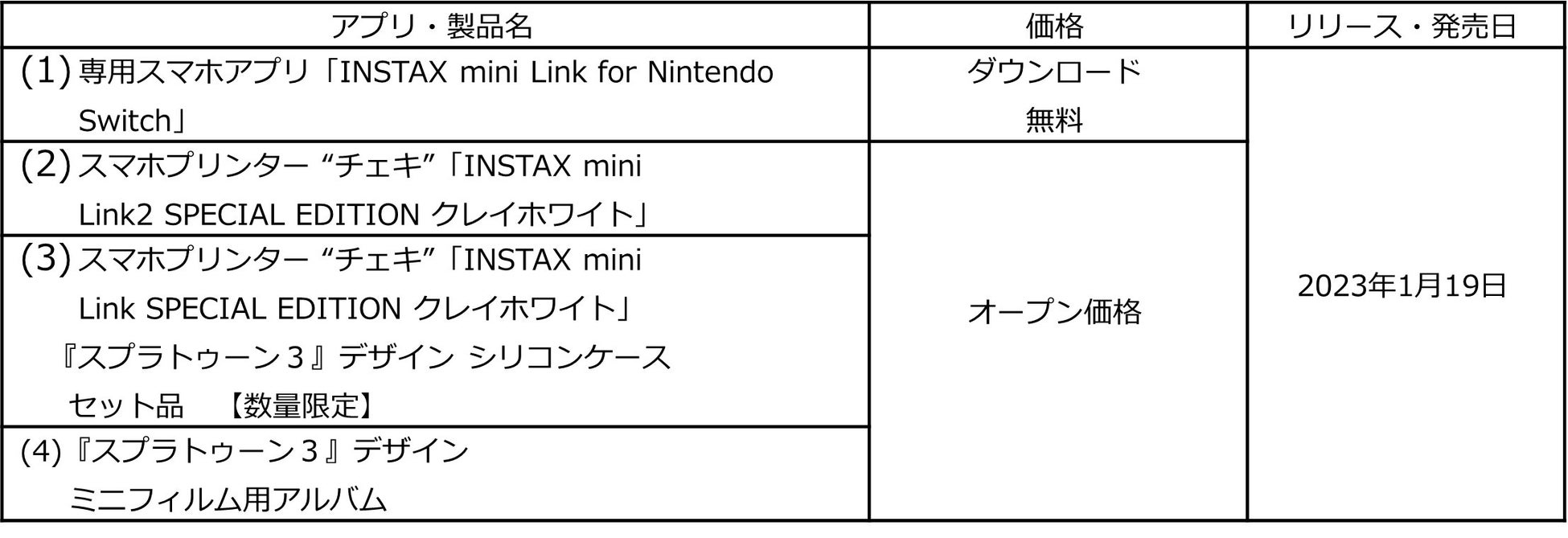 また、「Link 2」の新たなデザインモデルとして、本体上部にあるプリント出力部と正面にある電源ボタンの周りにブラックのラインをあしらった、スマホプリンター “チェキ”「INSTAX mini Link 2 SPECIAL EDITION クレイホワイト」(以下、「Link 2 SPECIAL EDITION」)と、『スプラトゥーン3』デザインのINSTAX ミニフィルム用アルバムを2023年1月19日より発売いたします。また、「Link 2 SPECIAL EDITION」と、『スプラトゥーン3』のイカとタコを大胆にデザインしたシリコンケースとのセット品を数量限定で同日に発売します。
