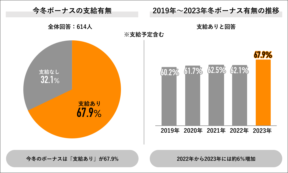 回答者全体の614人に2023年の冬ボーナスの支給有無を聞くと、「支給あり」が67.9%で過半数をしめ、「支給なし」が32.1%となりました。また冬ボーナス「支給あり」の推移を見ると、2019年が60.2%、2020年が61.7%、2021年が62.5%、2022年が62.1%と2019年から微増が続き2023年は過去最多の67.9%という結果になりました。
