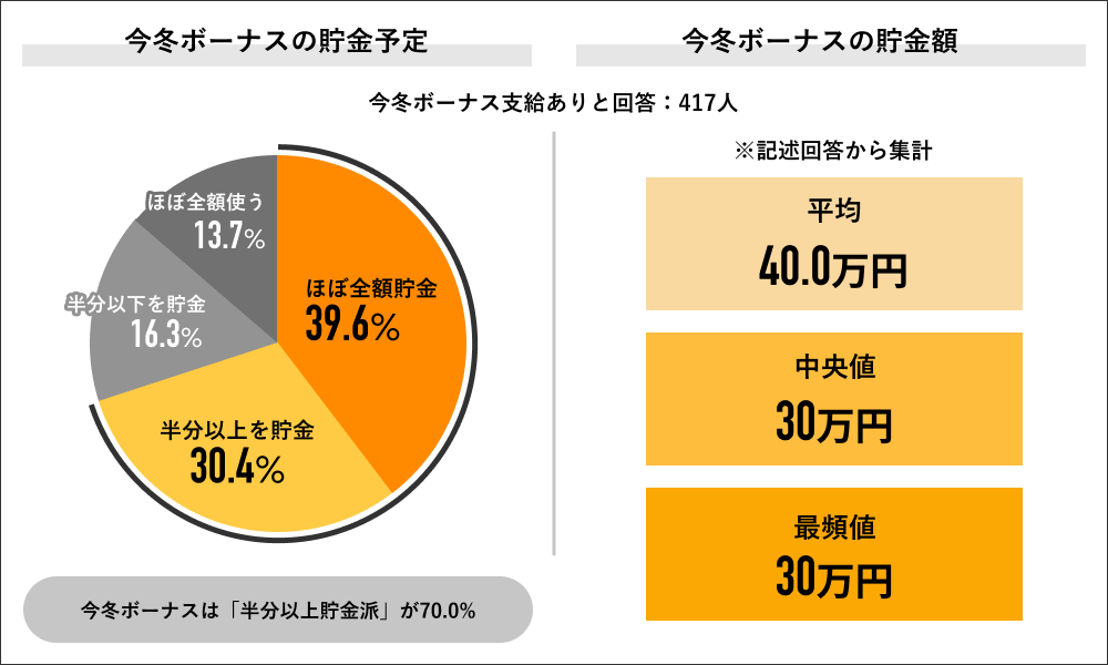 今冬ボーナス支給ありと回答した417人に今冬ボーナスの貯金予定を聞くと、「ほぼ全額貯金」が39.6%、「半分以上を貯金」が30.4%と、「貯金派」は全体の70.0%の結果となりました。また今冬ボーナスの平均貯金額は40.0万円、中央値が30万円、最頻値が30万円となり、今冬ボーナスの平均支給額66.5万円に対して60.2%を貯金する結果となりました。