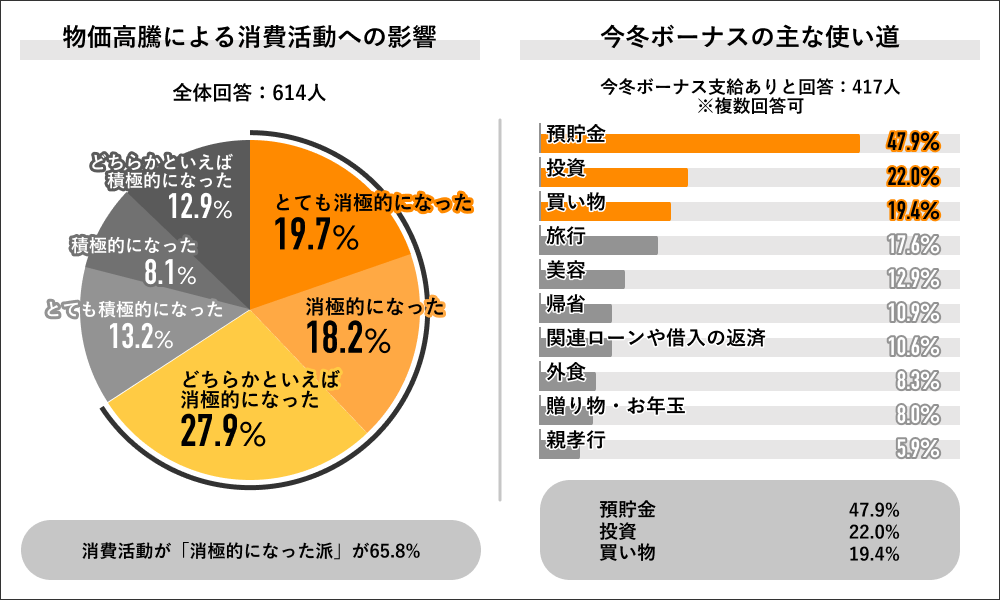 回答者全体の614人に物価高騰による消費活動への影響を聞くと、「消極的になった派」が65.8%になり、内訳は「とても消極的になった」が19.7%、「消極的になった」が18.2%、「どちらかといえば消極的になった」が27.9%でした。今冬ボーナス支給ありと回答した417人に今冬ボーナスの主な使い道を聞くと、「預貯金」が47.9%で最多となり、次いで「投資」が22.0%、「買い物」が19.4%と、上位3つの回答となりました。
