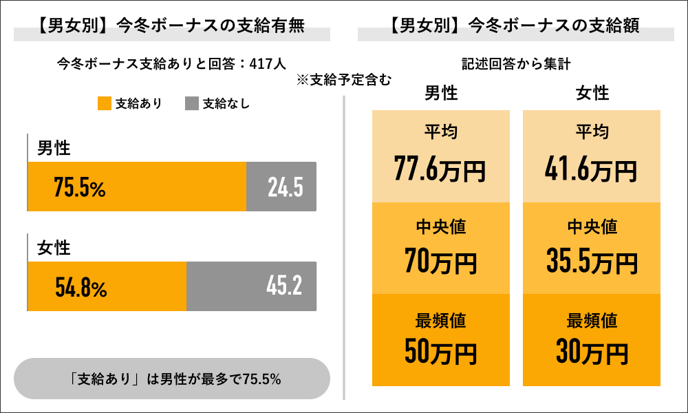 今冬ボーナスの支給有無を男女別に見てみると、支給ありと回答した男性が75.5%、女性が54.8%となっています。また、男女別の支給額を見ていくと、男性の平均額が77.6万円、中央値70万円、最頻値50万円に対して、女性の平均額は41.6万円、中央値35.5万円、最頻値が30万円という結果になり、平均額で36.0万円、中央値で34.5万円、男性の支給額が女性よりも高い結果となりました。