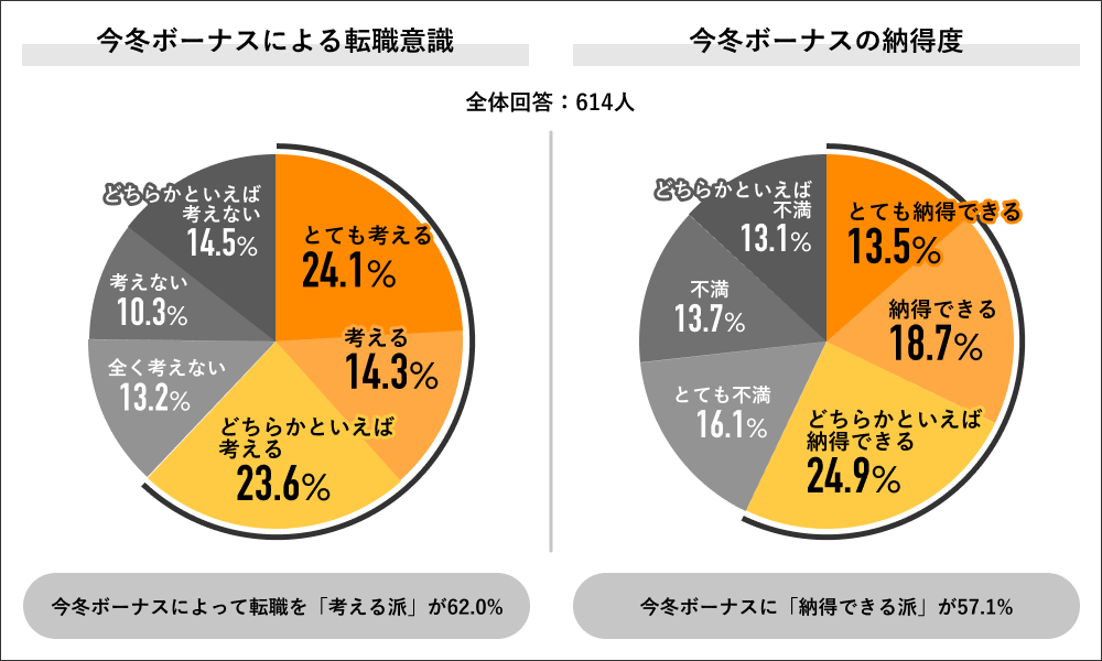 回答者全体の614人に今冬ボーナスの有無や支給額を踏まえた転職意識を聞くと、転職を「考える派」が62.0%になり、内訳は「とても考える」が24.1%、「考える」が14.3%、「どちらかといえば考える」が23.6%でした。同回答者に今冬ボーナスの納得度を聞くと、「納得できる派」が57.1%になり、内訳は「とても納得できる」が13.5%、「納得できる」が18.7%、「どちらかといえば納得できる」が24.9%でした。