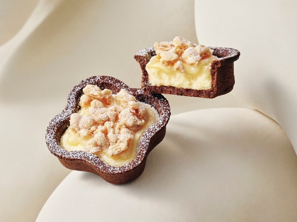 北海道産マスカルポーネチーズムースに、やさしい甘さのミルクソースを重ねたミルク感たっぷりな味わいのチーズタルト。ココアとアーモンドパウダーを練り込んだザクっと香ばしいタルトカップが、心地よい食感のアクセントに。仕上げにサクサクのクランブルをトッピングしました。奥深い味わいと食感のコントラストをお楽しみください。