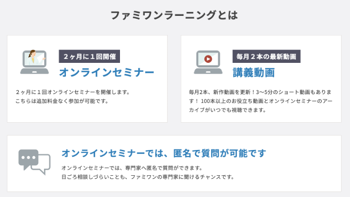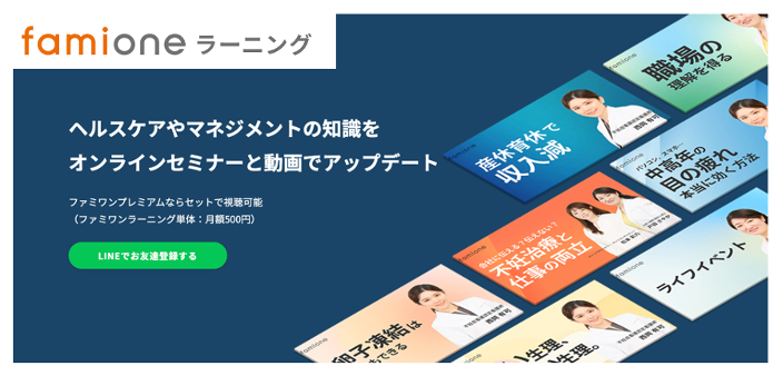 オンライン動画学習サービス「ファミワンラーニング」ではこれまで提供してきた「妊活ライブ」と同様に、月額500円で会員さま向けオンラインセミナーの開催や約200本のアーカイブ動画の提供を行います。今後は妊活・不妊治療はもちろんのこと、更年期、メンタル症状、仕事や家庭で役立つコミュニケーションスキルなど、幅広いテーマで動画提供を行ってまいります。
