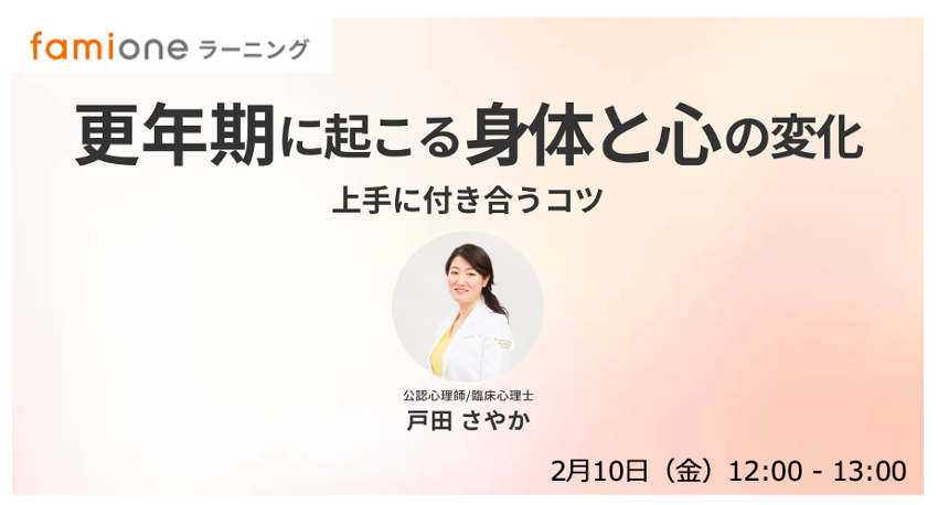 2月10日に開催する「更年期に起きる身体と心の変化~上手に付き合うコツ~」では、ファミワン臨床心理士の戸田さやかが、男女の更年期の基礎知識と、更年期を上手に過ごすヒントについて解説します。「ファミワンラーニング」会員さまは後日アーカイブでもご視聴いただけます。
