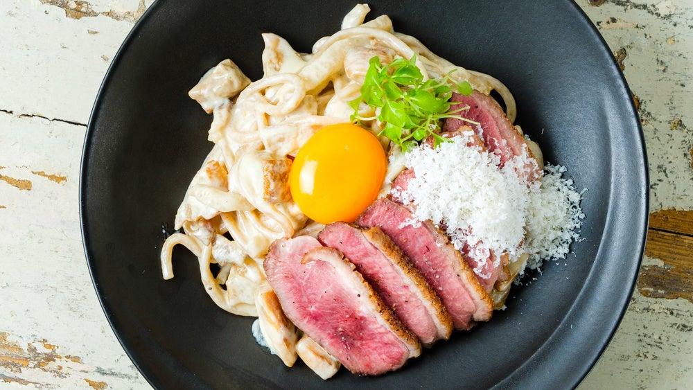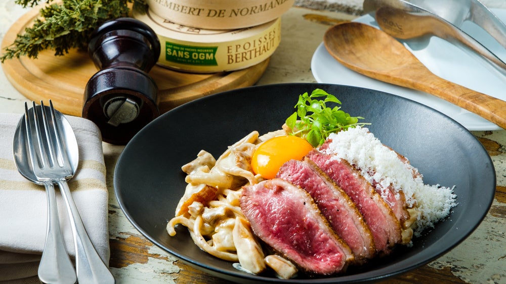 北海道産 鴨のローストを豪快にトッピングした炎のカルボナーラ期間限価格(4400円→2900円)にて販売開始いたします。恵比寿Cheese Tavern CASCINA(チーズタバーンカシーナ)