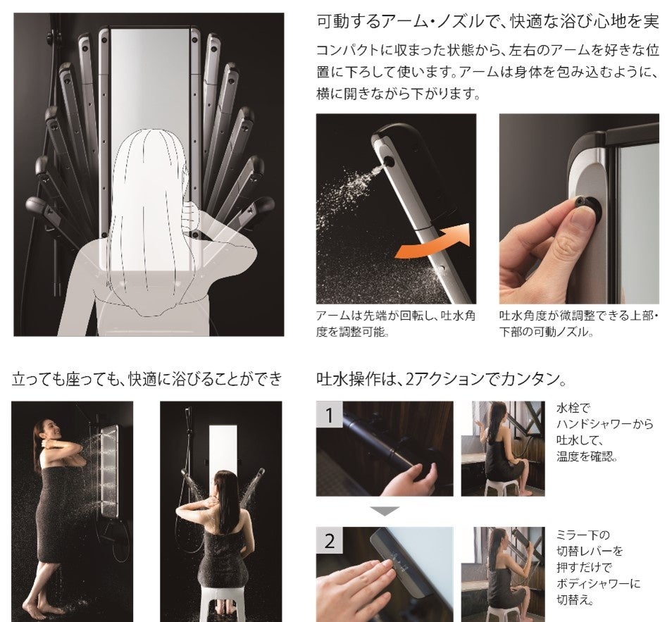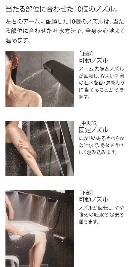 10個あるノズルは、位置により水の出方や量を変化させています。首や足にはややストレートに、胸やお腹には広く霧状に吐水し、身体全体でちょうどよい浴び心地と温まりを感じられる設計にしています。また、アームは可動式で当たる位置を調節でき、先端部分は回転させて首や肩にダイレクトに、ピンポイントに当てることができます。アームを手前に傾ければ、風呂椅子などに座った状態でも使用でき、浴槽に入ることが困難で寒くなりがちな方にも、全身が温まるシャワーを満喫いただけます。