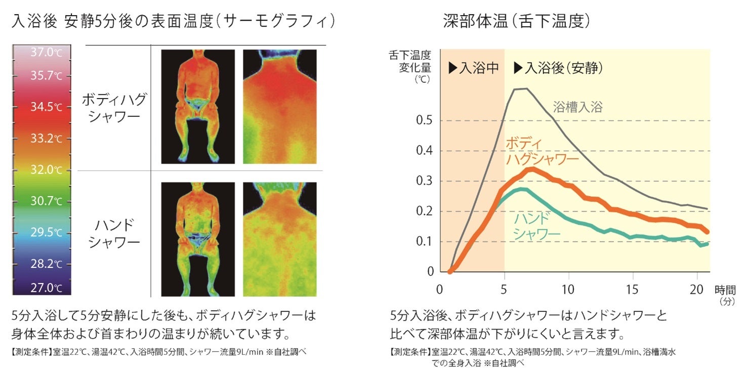 ボディハグシャワーは、5分間浴びるだけで、従来のシャワー浴よりも身体全体が温まります。ハンドシャワーによる入浴と比べ、全身および首まわりにおいて入浴後の温まりが持続します。また、舌下温度計測による深部体温についても、ハンドシャワー入浴に比べて深部体温が下がりにくいと言えます。