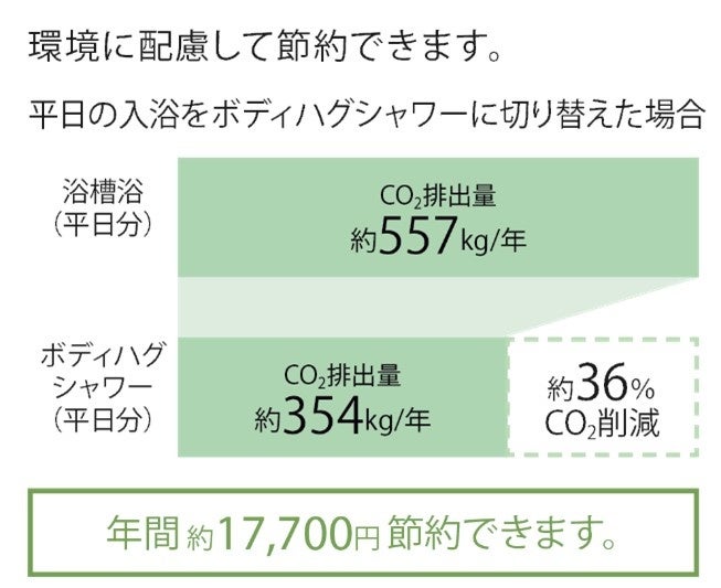 効率的に全身が温められると同時に浴槽の利用および清掃が減る分、浴槽浴利用と比較し、水量およびお湯をわかす時間が減り、浴槽浴と比較し約36%のCO2削減に貢献し、年間で水道料金とガス料金あわせて約17,700円節約。環境に配慮された製品です。