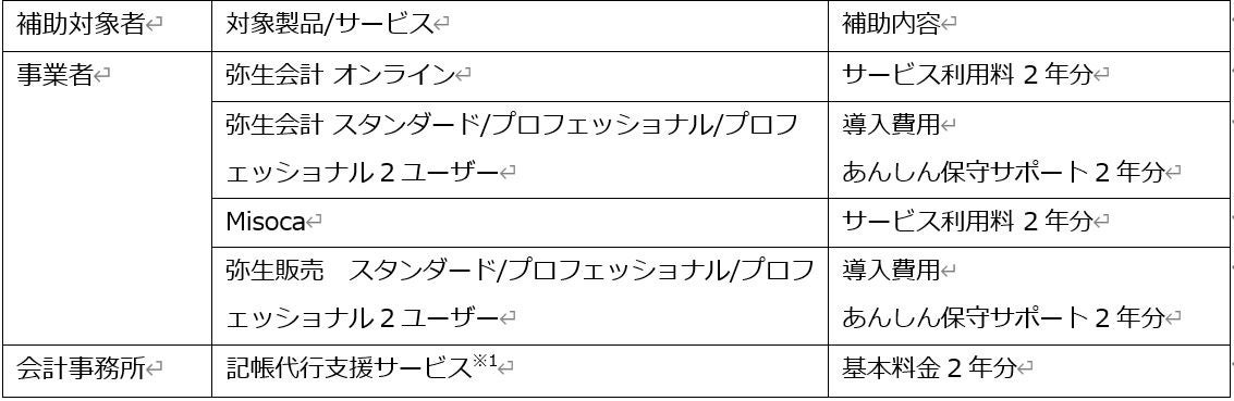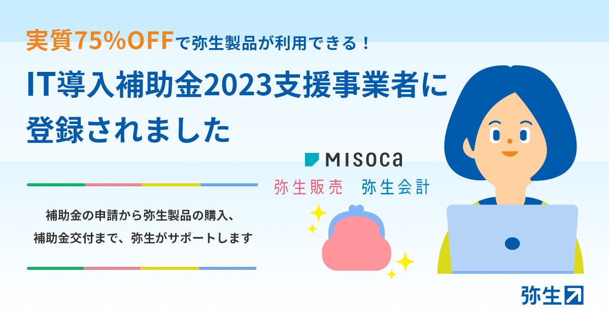 IT導入補助金は、ITツール導入経費の一部を補助することで、日本の中小企業・小規模事業者等の業務効率化や売上向上をサポートする目的で実施されるものです。弥生は「IT導入補助金2023」の支援事業者として登録されました。該当する「弥生会計」をはじめとした会計ソフトウエア、「Misoca」「弥生販売」「記帳代行支援サービス」を導入される際、導入費用および2年分の利用費に対して最大75%の補助を受けることができます。IT導入補助金は過去弥生の提供した初年度無償キャンペーンをご利用いただいたユーザーも活用することができます。制度の詳細は公式サイトをご確認ください。