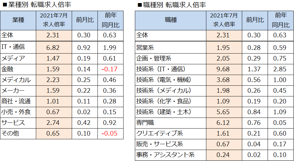 2021年7月の転職求人倍率は、前月比+0.30ポイントの2.31倍となりました。求人数は前月比105.8%、前年同月比138.6%となりました。転職希望者数は前月比91.9%、前年同月比100.9%でした。