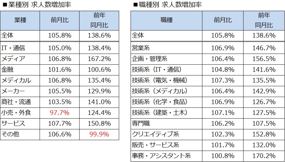 業種別では、「その他」を除く8業種のうち、「小売・外食」以外の7業種で求人数が前月より増加しました。求人の増加率が最も高かったのは「サービス」(前月比107.7%)、次いで「メディア」「メディカル」(いずれも前月比106.8%)でした。職種別では、11職種すべてで求人数が前月より増加しました。求人の増加率は、高い順に「技術系(電気・機械)」(前月比107.3%)、「技術系(建築・土木)」(前月比107.1%)となりました。