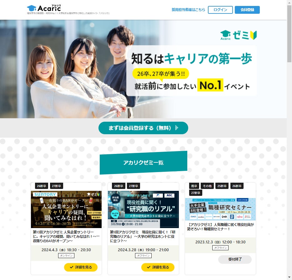 これまで就職情報サイト『アカリク』上にて、企業説明会(オープンカンパニー)や就職活動の対策講座とあわせてアカリクゼミの情報を掲載しておりましたが、この度、アカリクゼミの特設ページを公開いたしました。