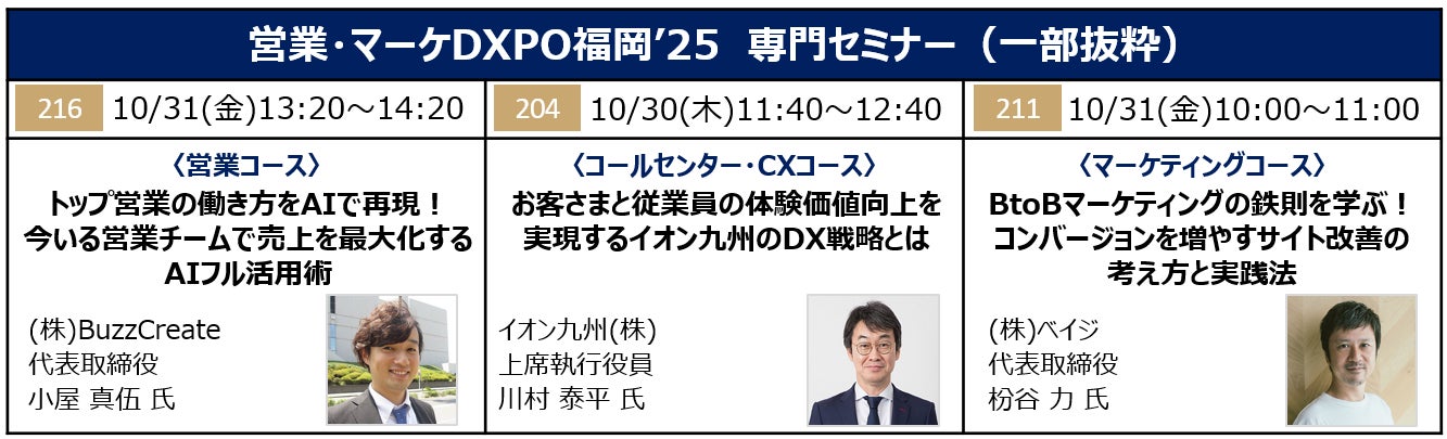 営業コースでは、リクルートで7年半にわたり営業・リーダー職を務めた(株)BuzzCreate 代表取締役 小屋真伍氏が、営業の業務効率が劇的に上がるAI活用術を解説。またコールセンター・CXコースでは、イオン九州(株) 上席執行役員 デジタルトランスフォーメーション責任者 川村泰平氏が、顧客と従業員の体験価値を向上させるために実践しているDX戦略を紹介する。他にも営業・マーケ部門をはじめ、売上アップ・生産性向上を目指す経営者必聴のセミナーが多数開催される。
