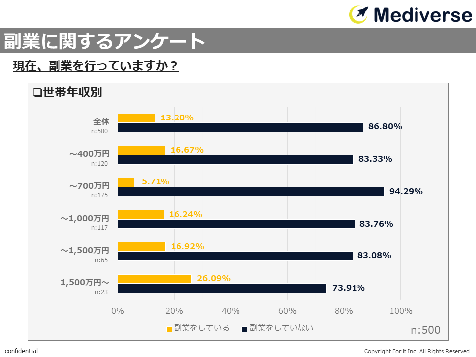 さらに、世帯年収別に見ると、500万円以上700万円以下の年収層は副業をしている割合がもっとも少なく、700万円以上の年収層は年収が上がるにつれて副業をしている割合が増え、1,500万円以上の年収層に至っては4人に1人以上が副業をしているという結果が出た。