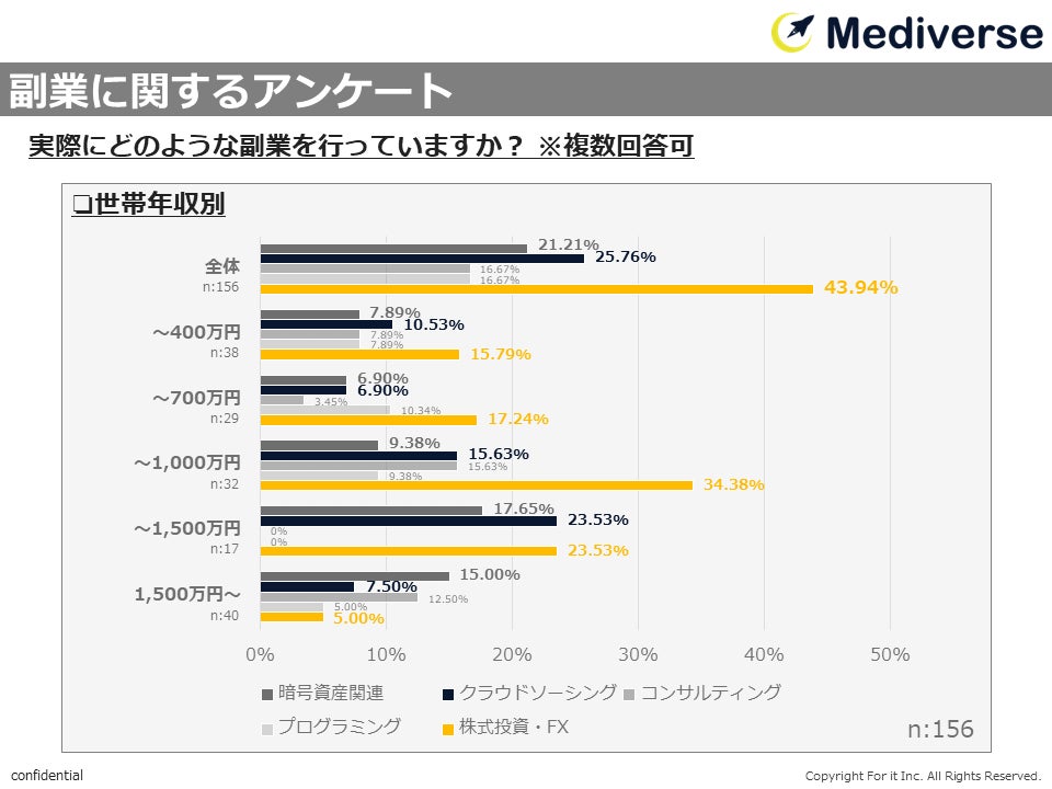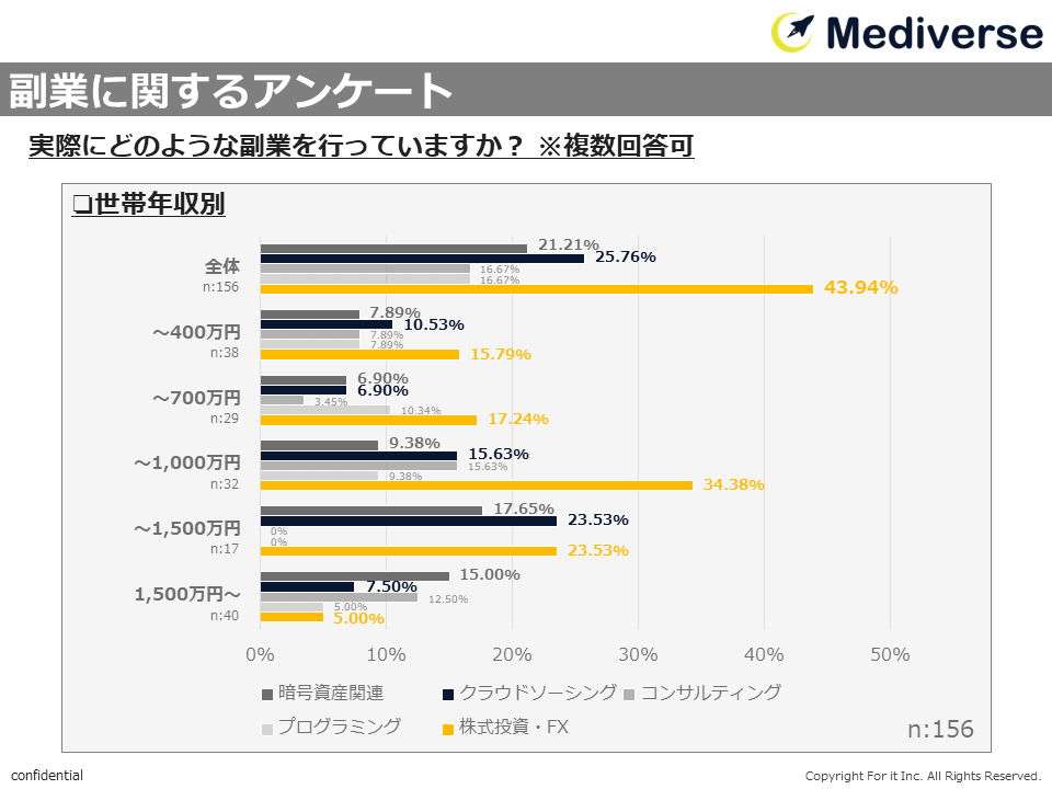 また、世帯年収別に見ると、1,000万円以下の年収層では「株式投資・FX」が首位である一方、1,000万円~1,500万円以下の年収層では、「株式投資・FX」と並んで「クラウドソーシング」が同率となり、1,500万円以上の年収層では、「株式投資・FX」の割合が大幅に縮小し、「暗号資産関連」と「コンサルティング」が占める構図となっていた。