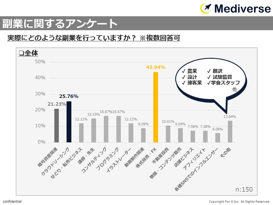 今回のアンケート調査結果では、約8人に1人が現在なにかしらの副業を行っており、その内容として「株式投資・FX」を筆頭に「クラウドソーシング」「暗号資産関連」がTOP3として挙げられることが判明いたしました。