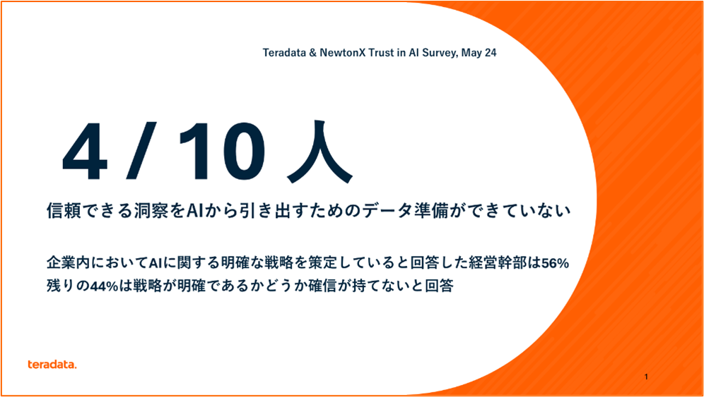 サンディエゴ発 - 2024年6月25日 - Teradataは、本日、AIがビジネスにもたらす影響について、企業の経営幹部とAIリーダー(以下、回答者)を対象として実施したグローバル調査の結果を発表します。本調査では、企業の意思決定者はAIのもたらすビジネス成果に期待しているものの、自社のAI戦略やデータそのものが、AIに精緻なアウトプットを要求できるレベルに達していないと考えていることがわかりました。具体的には、回答者の70%が自社のAI戦略が現在のビジネス戦略と完全に整合していないと回答しています。さらに、61%がAIのアウトプットの信頼性と妥当性を十分に信頼していると答えた一方で、40%は自社のデータが正確な成果を達成する準備がまだ整っていないと評価しています。