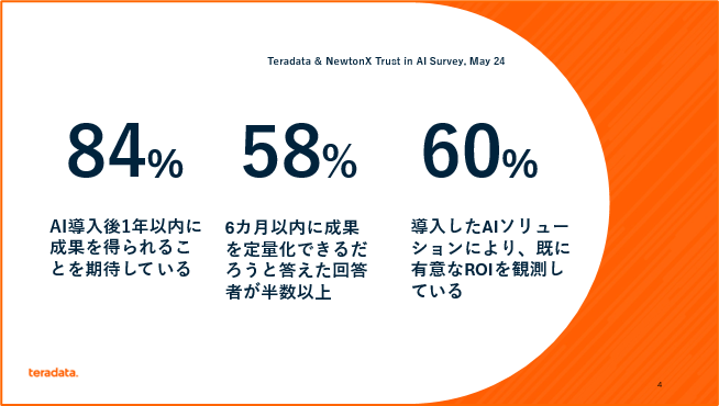 本調査は、グローバル規模のB2B市場調査で多くの実績を持つNewtonX社がTeradataの依頼で実施したもので、AI分野の専門家へのインタビューと、自社のAI戦略と実行について内部事情を知るエグゼクティブを対象とした定量調査で構成されています。米国、欧州、英国、アジアの、従業員1,000人以上、年間売上7億5,000万ドル以上の大企業、中堅企業のAI戦略と実行について理解している経営幹部や意思決定者を対象とし、全員が業務においてAIを担当または利用しています。対象には、Nike、P&G、 Hermes Paris、 Allianz Partners、Prudential Financial、 Honeywell、Novartis などのAIを活用する企業の幹部約300名です(内約半数は米国企業)