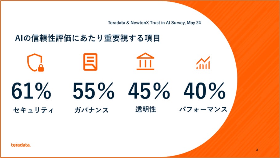 ・AIの信頼性評価にあたり重要視される項目:セキュリティ(61%)、透明性(55%)、ガバナンス(45%)、性能(40%)