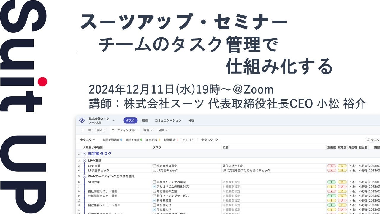 株式会社スーツ(所在地:東京都千代田区、代表取締役社長CEO:小松 裕介)は、2024年12月11日(水)19時から、当社代表の小松が講師を務めるスーツアップ・セミナー「チームのタスク管理で仕組み化する」を無料開催します。