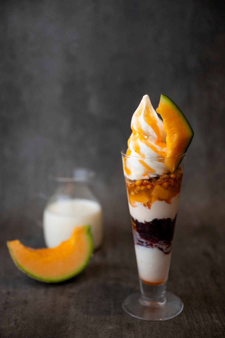北海道ミルクのジェラートにメロンの果肉・シャンティ・グラノラを重ねた、まるで北海道の夏をつめこんだような期間限定パフェ。