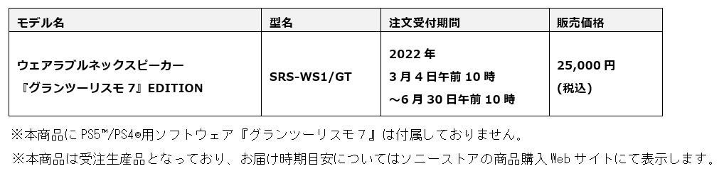 ソニーマーケティング株式会社は、PlayStation®5(PS5™)、PlayStation®4(PS4®)用ソフトウェア『グランツーリスモ7』の本日3月4日(金)発売を記念して、同作品とコラボレーションしたウェアラブルネックスピーカー(『SRS-WS1/GT』)の注文受付を開始します。受付期間は本日3月4日(金)午前10時から6月30日(木)午前10時までの期間限定で、「グランツーリスモ」シリーズ25周年を記念した特別記念価格25,000円(税込)で提供します。