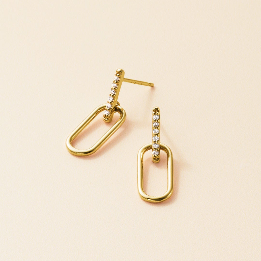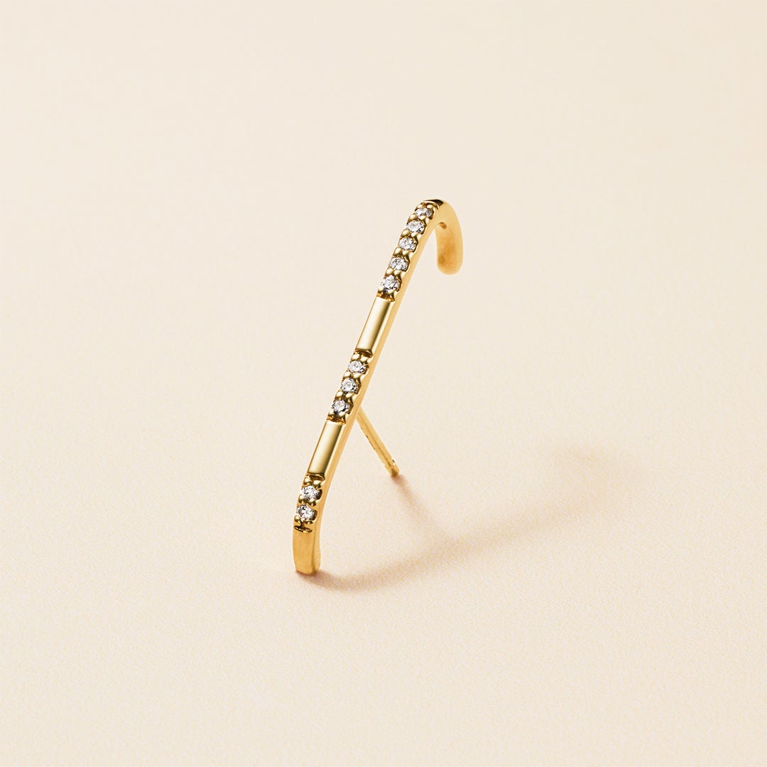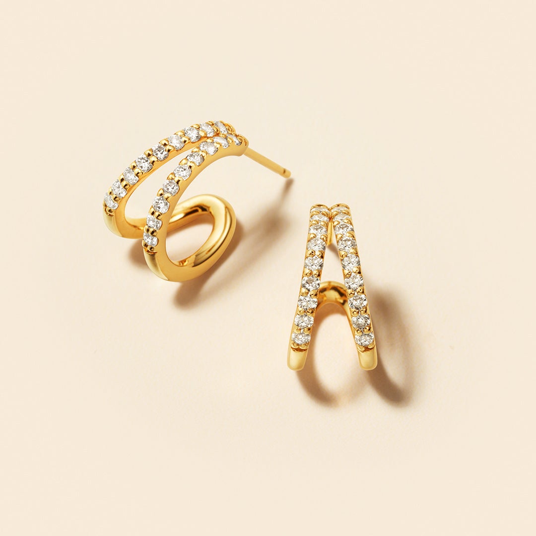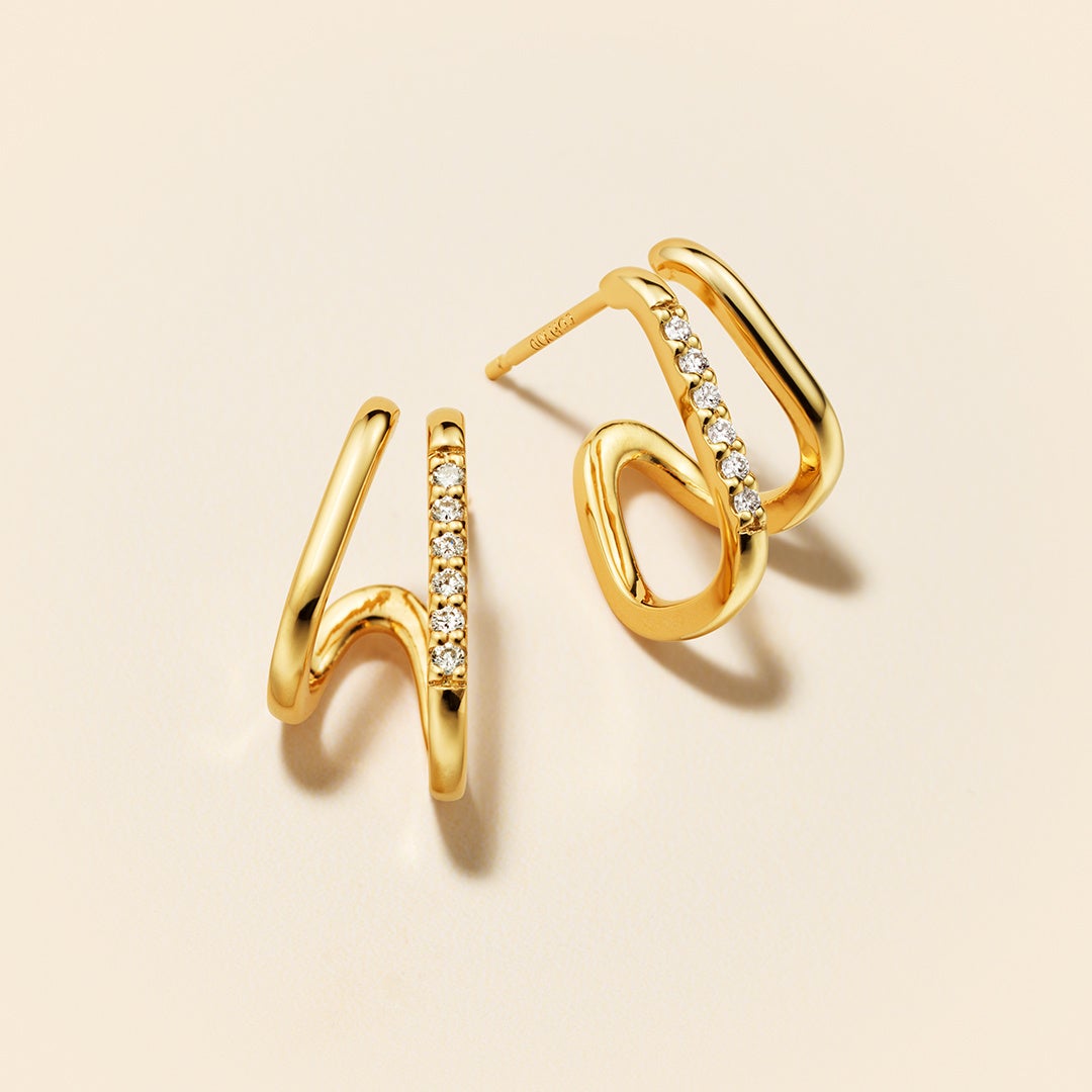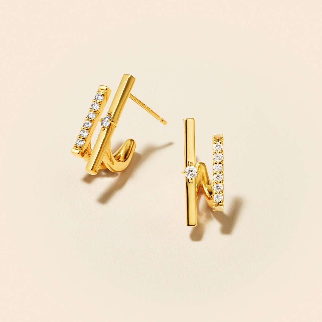 ラボグロウンダイヤモンドを贅沢にあしらい、耳元で溢れんばかりの輝きを放つ二連風ピアス。些細な仕草でも華やかに煌めき、顔まわりを明るく照らします。