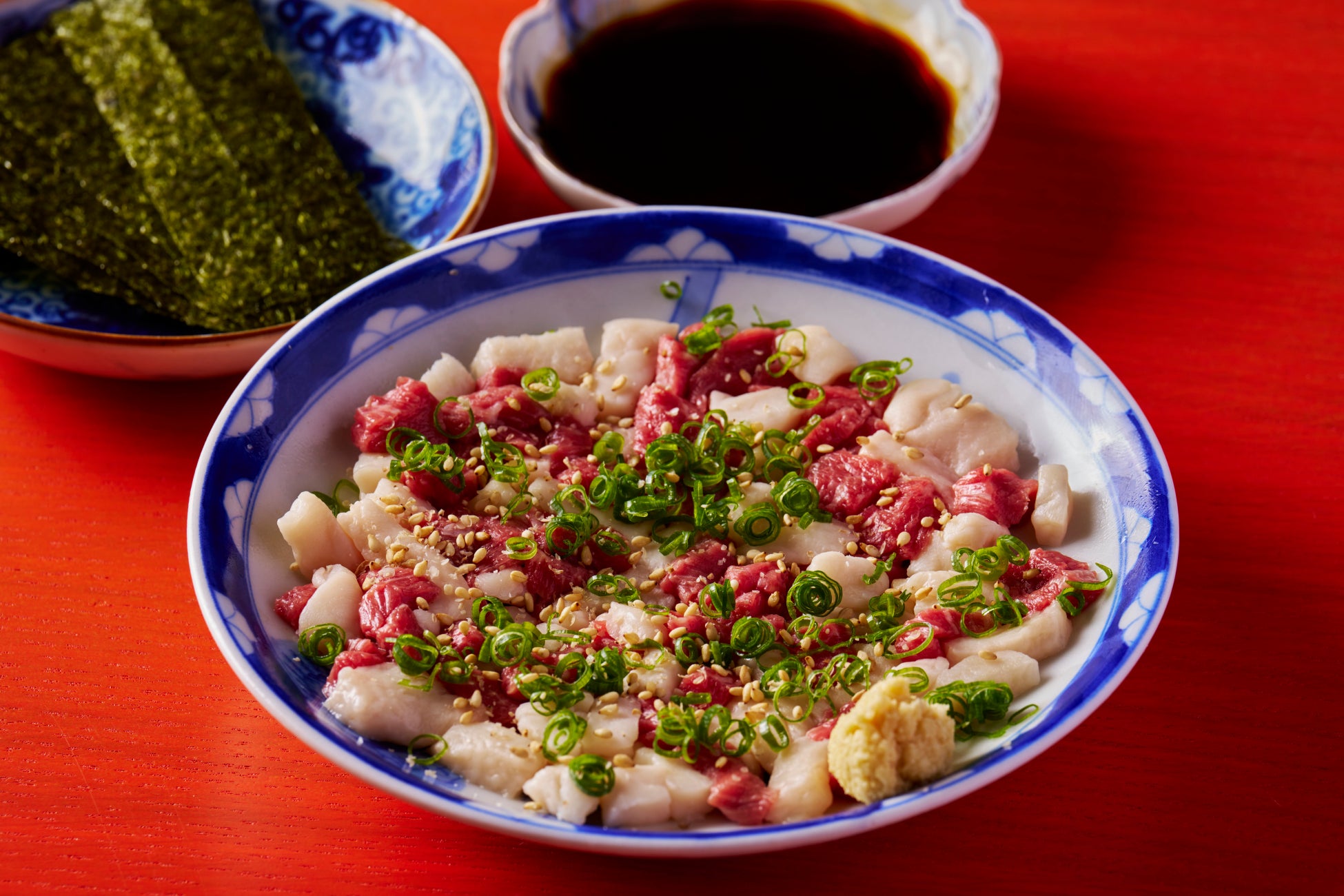 旨味と口どけを最高のバランスで味わえるように、赤身・タテガミ・脂を混ぜ黒糖醤油をかけてお召し上がりいただきます。