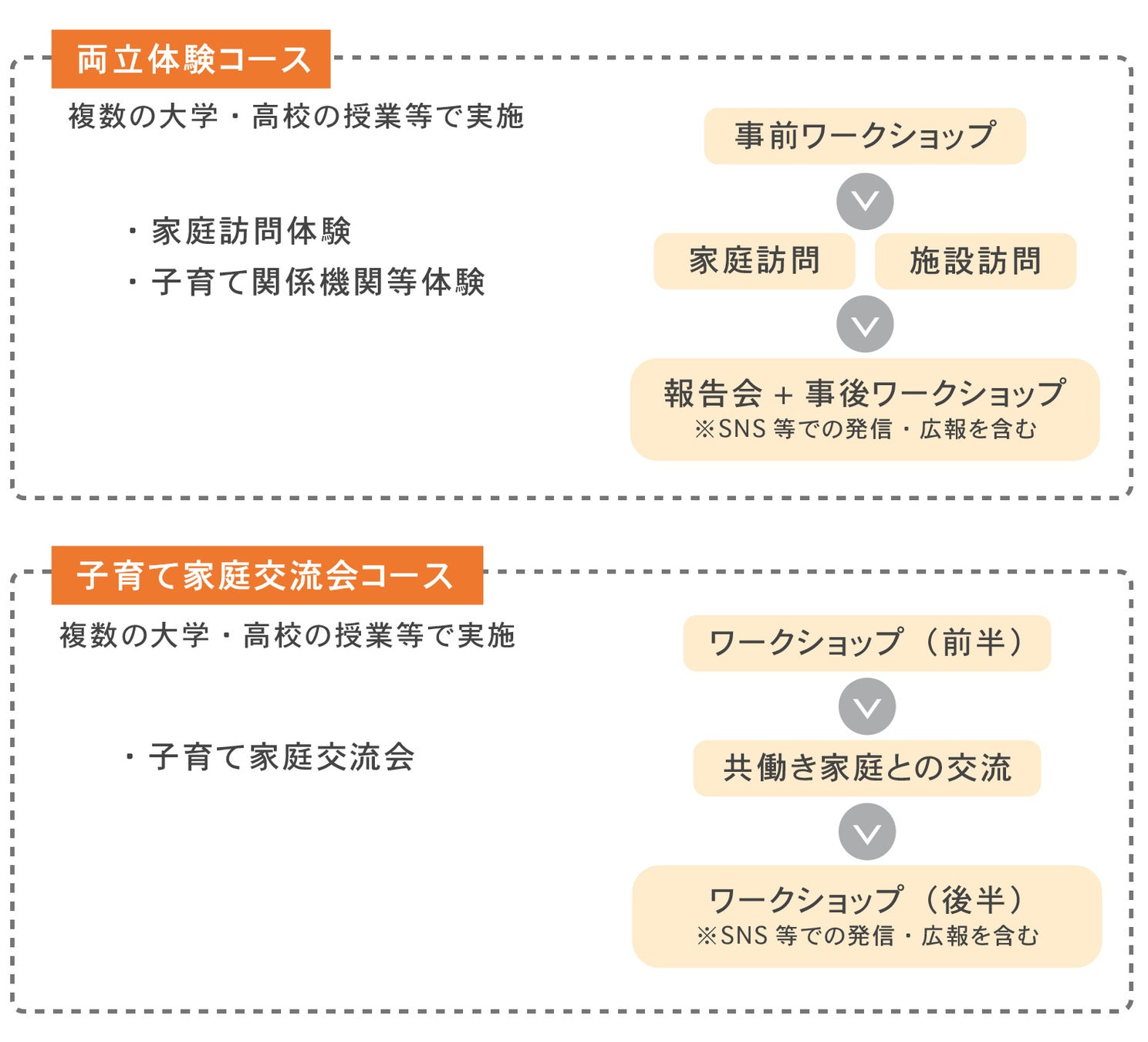 当プログラムでは、学生等が共働き・共育て家庭や子育て関係機関等を訪問(またはオンラインで交流)し、子どものいる環境に触れながら、自身のライフデザインを描く機会を提供します。また、交流の前後ではコネヒト社オリジナルのワークショップを実施し、ライフデザインに必要な知識のインプットを通じてクリエイティビティを最大限に発揮できる機会を提供いたします。