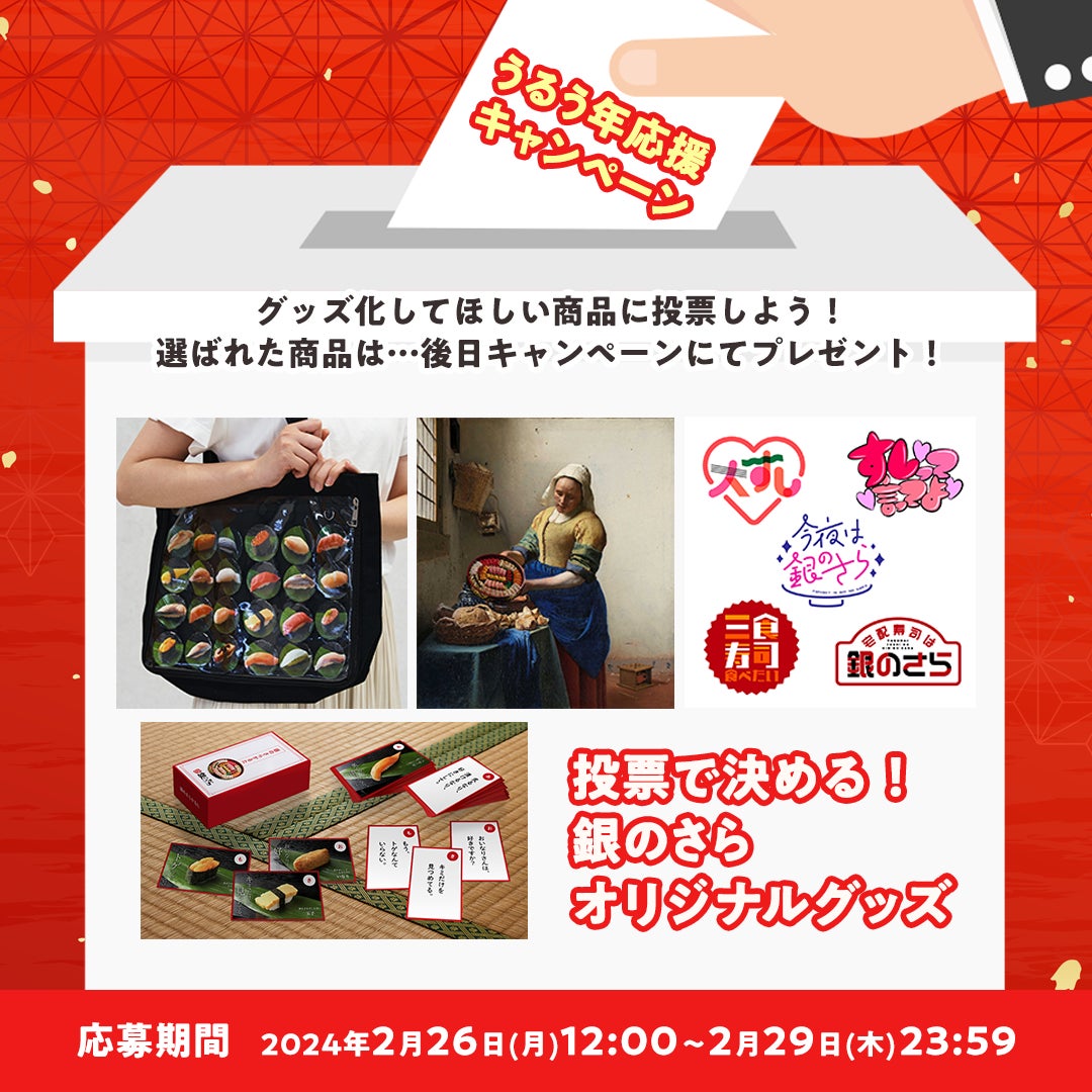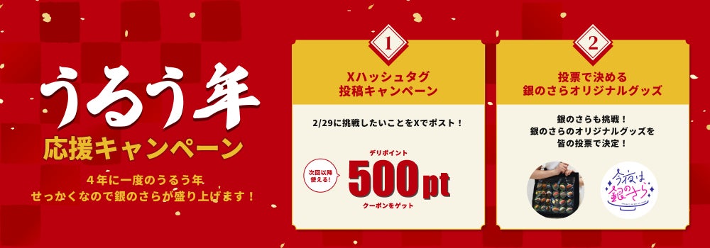 株式会社ライドオンエクスプレスホールディングス(本社:東京都港区、代表取締役社長:江見 朗)は、グループ企業が展開する、宅配寿司「銀のさら」において、2024年2月26日(月)~29日(木)に、『うるう年応援キャンペーン』を実施いたします。X公式アカウントでのハッシュタグキャンペーンや、投票で決める銀のさらオリジナルグッズ施策を展開いたします。