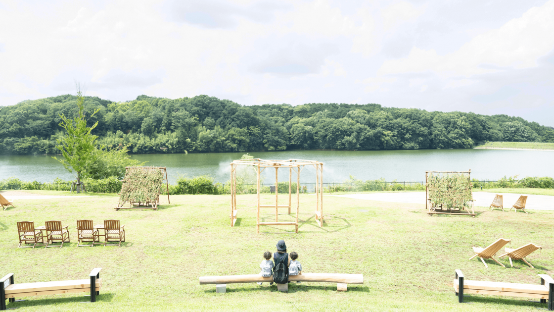 埼玉県飯能市の名産である「西川材」のヒノキを組んで制作した八角形のミストサークルに設置されたベンチに座ると、爽やかなヒノキの香りとともに、芝生の広場を吹き抜ける風やミストの涼しさを肌で感じることができ、涼しいミストとともにリラックス効果を得ることができます。