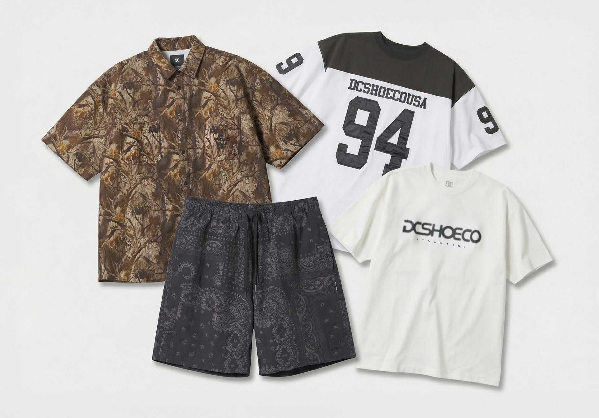 デザインには、ミリタリー要素を取り入れたカモフラージュ柄や、ストリートファッションと相性の良いバンダナ柄をキーパターンとして採用。これらのグラフィックを機能性素材と掛け合わせることで、真夏の過酷な環境でも快適に過ごせる実用性と、DCらしいカルチャー性を両立したデイリーに活躍するコレクションです。