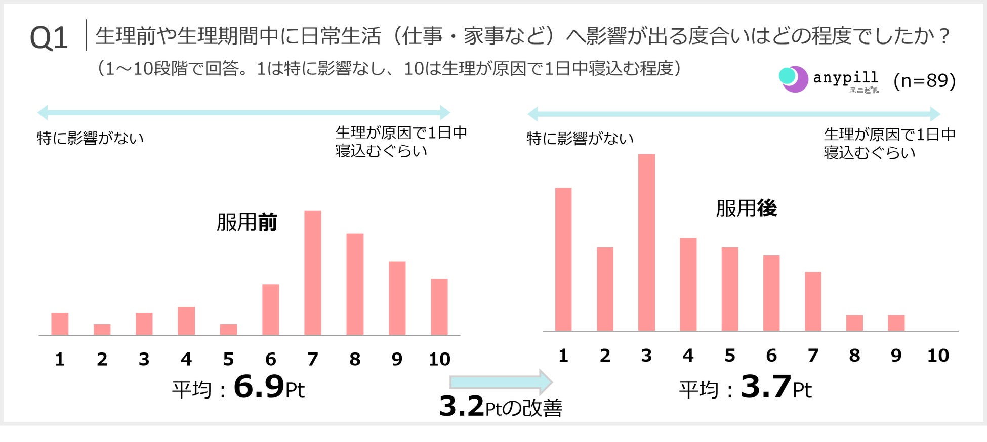 ・ピル服用前、日常生活への影響度合いは6.9Ptだったのに対し、服用後は3.2Pt改善された