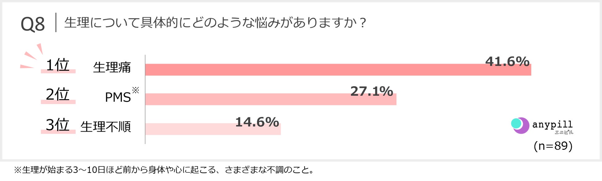 ・生理の悩み1位は「生理痛」。次いで「PMS」と呼ばれる月経前症候群、「生理不順」がランクイン