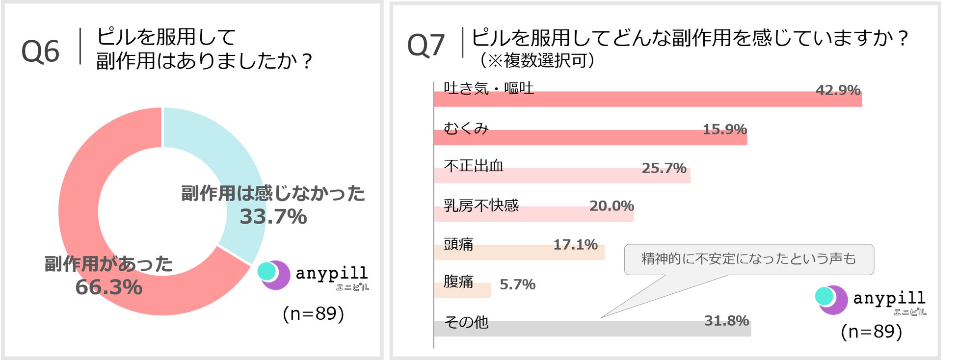 ・ピルを服用した方の6割が「吐き気」「むくみ」など何かしらの副作用を感じている