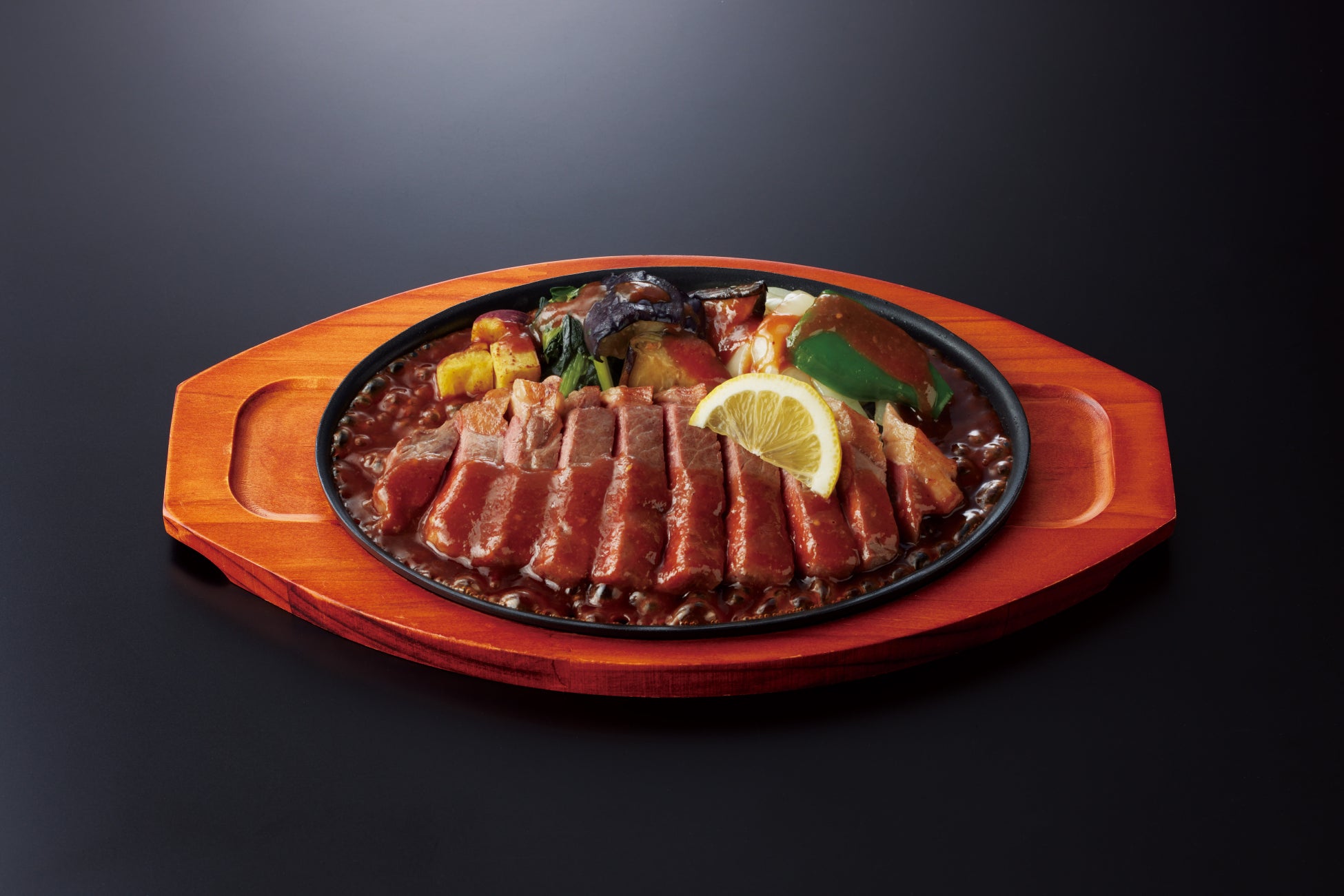 ステーキをカットした後、お客様用の鉄板に盛り付けてから味噌だれをかけることで鉄板の熱で味噌だれが煮え、ステーキの断面に熱が入る仕組みとなっています。これにより、ステーキを一番旨い焼き加減にすることができます。