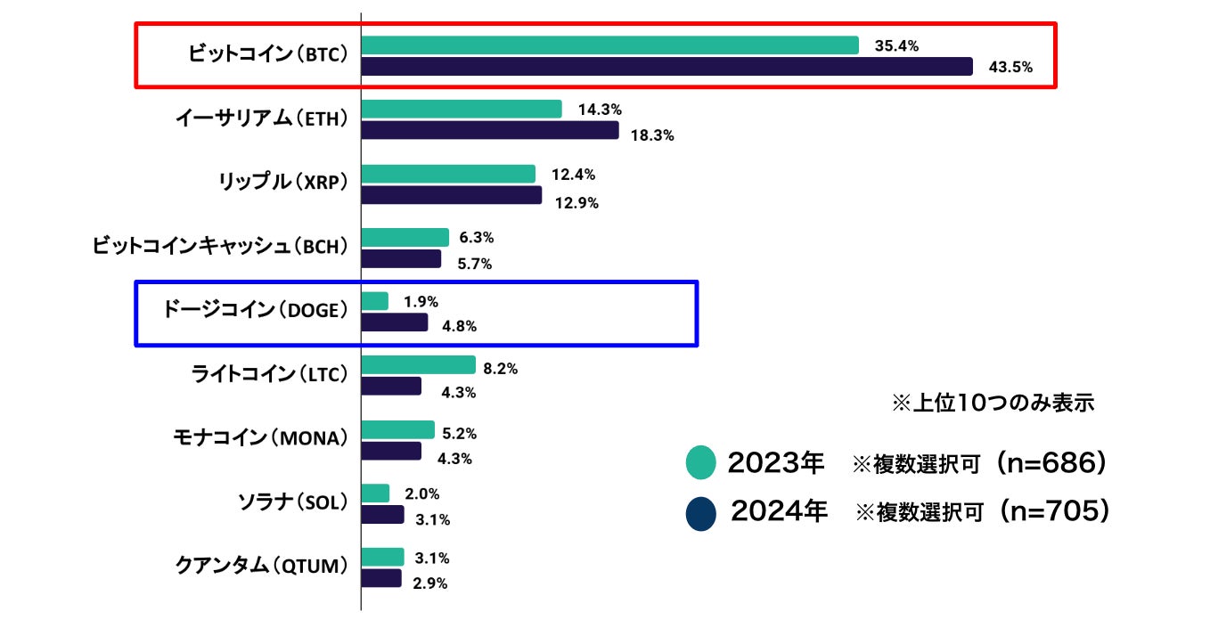 「資産運用している」と答えた方へ【Q 2025 年1 月1 日から12 月31 日において、最も期待している暗号資産銘柄は?】では、「ビットコイン」が最も多く、次いでイーサリアム、リップルが多い結果となりました。また、2023年アンケート調査では1.9%だったドージコインがランクインしました。米実業家イーロン・マスク氏のソーシャル・メディアXでの投稿などが一部投資家の関心を集めていることが見受けられます。