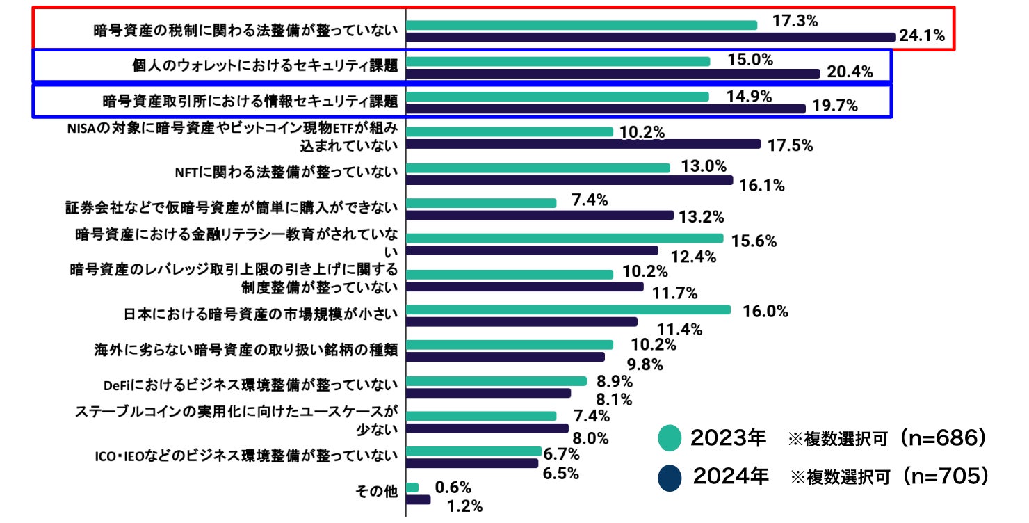 「資産運用している」と答えた方へ【Q 暗号資産業界の課題としてあてはまるものは何ですか?】では、「税制に関わる法整備が整っていない」が2023年と比較して7.4%増の24.1%と最も多く、業界の課題が浮き彫りになる結果となりました。次いでセキュリティ課題として「個人のウォレットにおけるセキュリティ課題」と「暗号資産取引所における情報セキュリティ課題」となり、今年5月に発生した他の暗号資産取引所より不正流出が投資家層に警戒感を与えたことが背景にあると考えられます。
