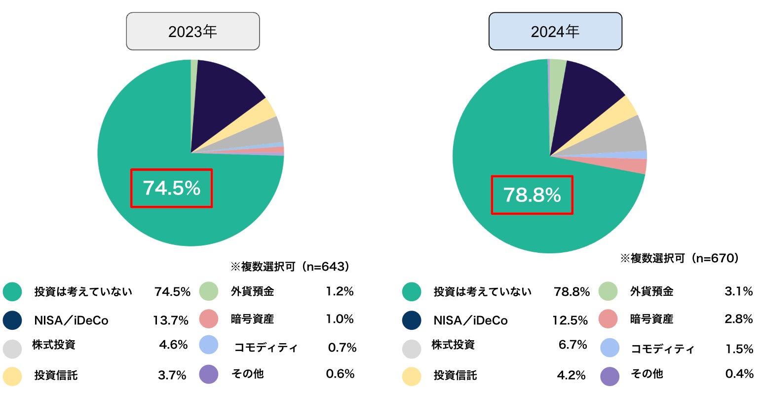 「資産運用していない」と答えた方へ【Q2025年から投資を始めようと思っている資産運用を教えてください。】では、「投資は考えていない」と回答した人は2023年より4.3%上昇し、78.8%と最も多い結果となりました。Q4.資産運用をしていない理由として「余裕のある資金がないため」が挙げられており、余剰資金の減少がさらに投資から遠ざかっているように考えられます。