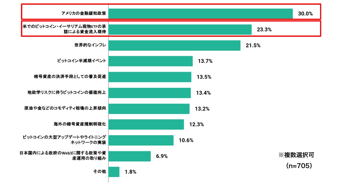 Q13. 価格上昇の理由として「アメリカの金融緩和政策」「米ビットコイン・イーサリアム現物ETF承認による資金流入期待」が上位