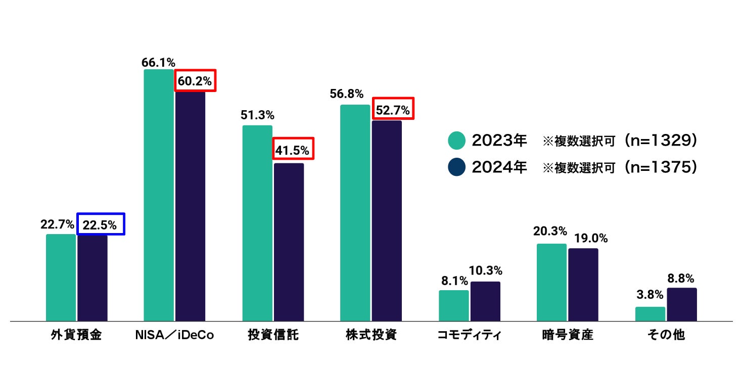 「資産運用している」と答えた方へ【Qあなたの資産運用を教えてください。】では、投資対象として「NISA/iDeCo」60.2%と挙げており、次いで「株式投資」「投資信託」という結果になりました。今年はニュースなどで、円安に関する報道を目にすることが多く、外貨預金の増加は0.2%に止まり、多くの投資家は株式投資などで円安のリスクヘッジをおこなっていたことが想定されます。