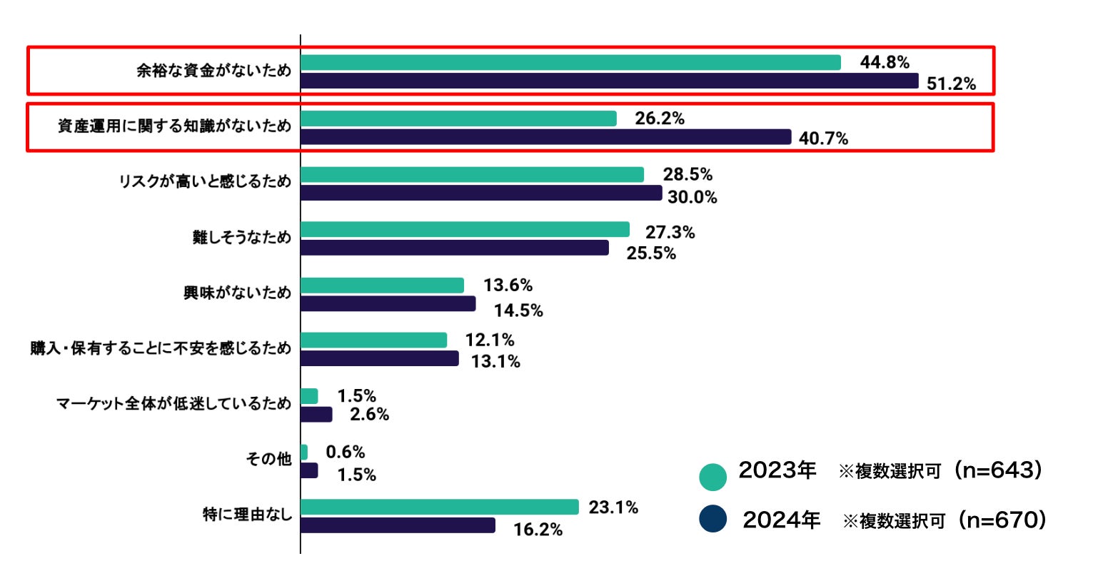 「資産運用していない」と答えた方へ【Q 資産運用していない理由は何ですか?】では、「余裕な資金がないため」を挙げた方は2023年同様にトップとなり、次いで「資産引用に関する知識がないため」が40.7%という結果となりました。余剰資金不足が、資産運用に関する基礎知識を学ぶ意欲を削ぐ要因になっている可能性が考えられます。