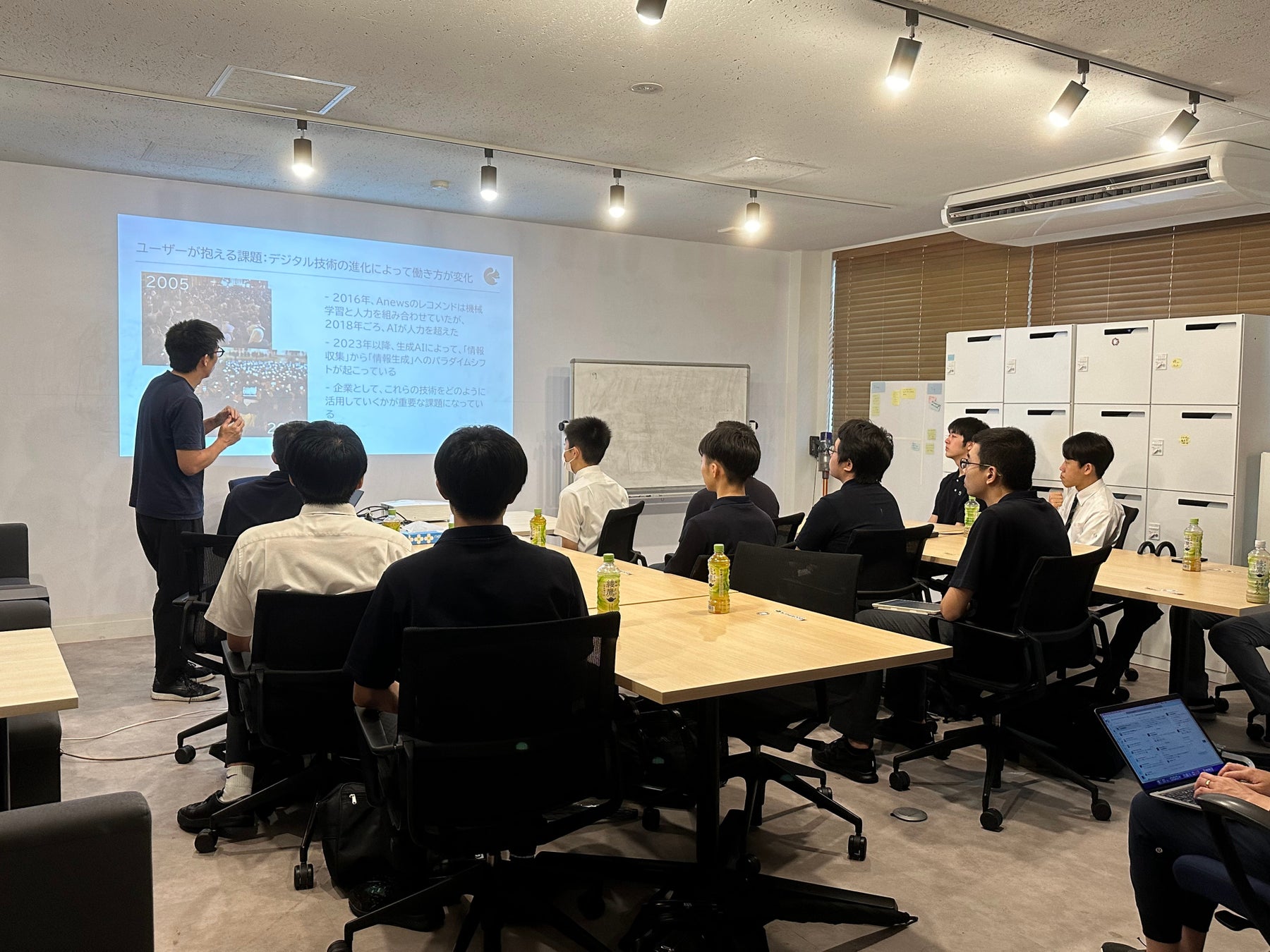 2024年8月末に開催した座談会では、芝浦工大付属中学高等学校より、高等部の生徒10名と先生1名の計11名が当社オフィスへ来訪しました。当社社員より挨拶と自己紹介の後、座談会を開始しました。