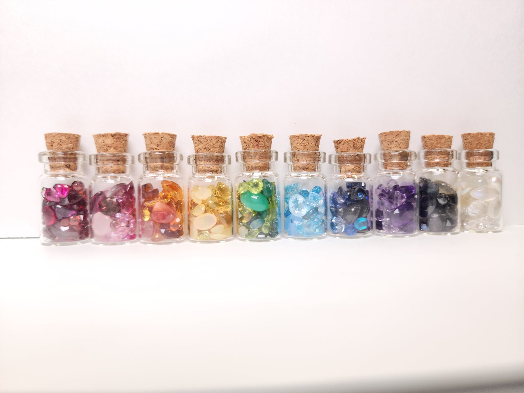 推しのイメージカラーをテーマに、赤・青・黄・オレンジ・緑・水色・紫・ピンク・白・黒の全10色を展開。それぞれの色をイメージした本物の宝石を約10.0~15.0ct封入した小瓶です。