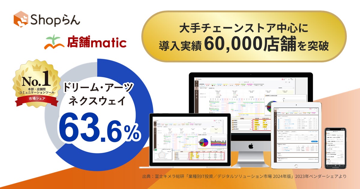 大企業向けクラウドサービスを提供する株式会社ドリーム・アーツ(東京本社:東京都渋谷区、広島本社:広島県広島市、代表取締役社長:山本 孝昭、以下 ドリーム・アーツ)とTISインテックグループの株式会社ネクスウェイ(本社:東京都江東区、代表取締役社長:松森 正彦、以下ネクスウェイ)(※2)は、2024年8月に多店舗オペレーション改革を支援するクラウドサービス「Shopらん(R)(ショップラン)/店舗matic(テンポマティック)」の導入実績が60,000店舗を突破したこと、またマーケット調査会社の株式会社富士キメラ総研(以下、富士キメラ総研)が発刊した「業種別IT投資/デジタルソリューション市場 2024年版」において、本部・店舗間コミュニケーションツール市場シェア63.6%でNo.1(※1)を獲得したことを発表します。
