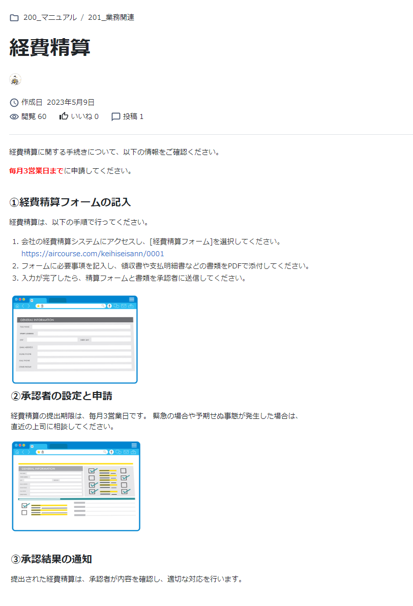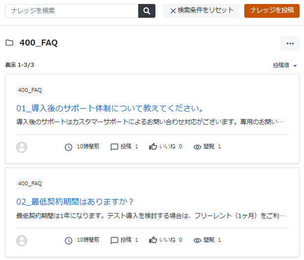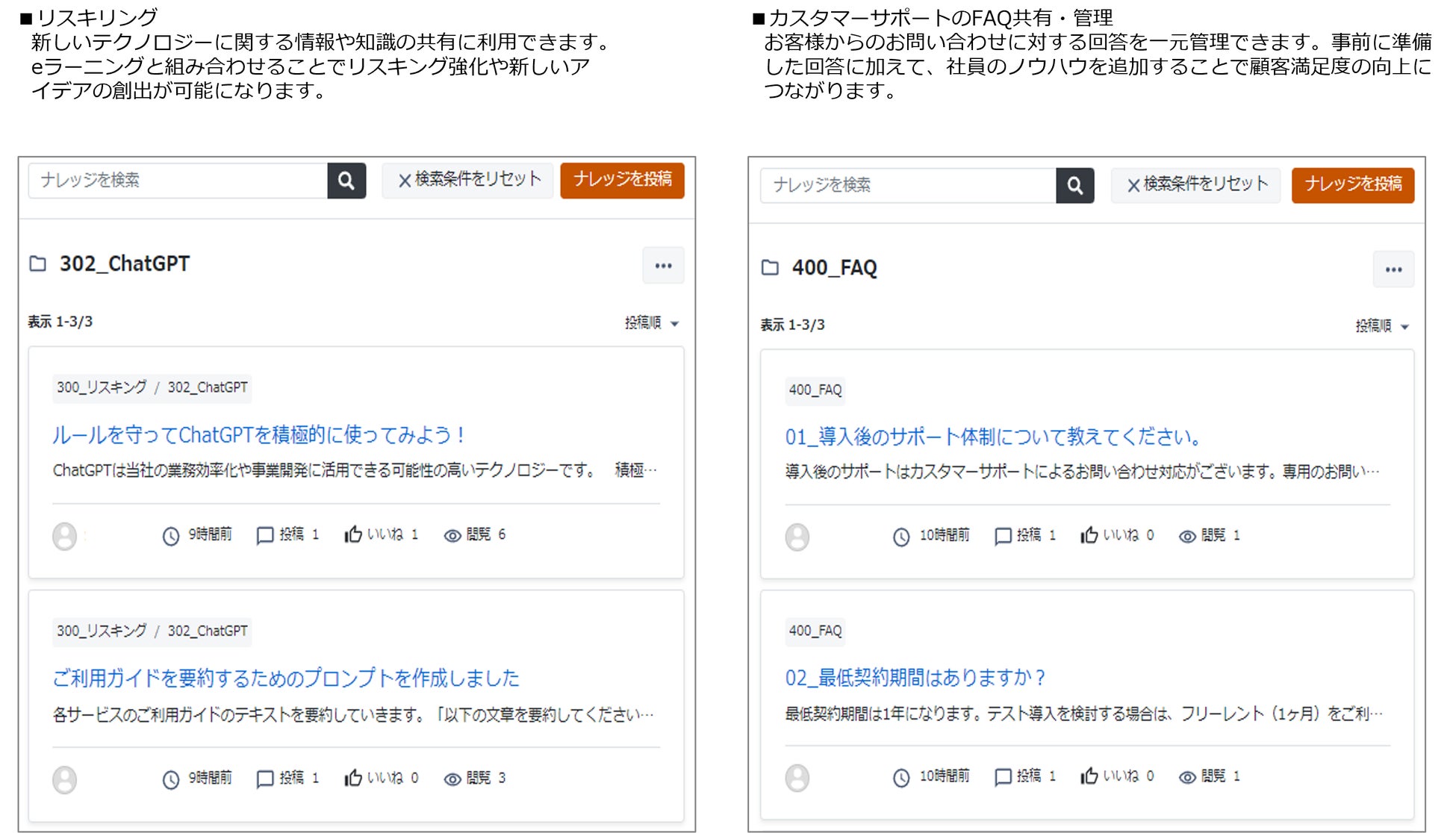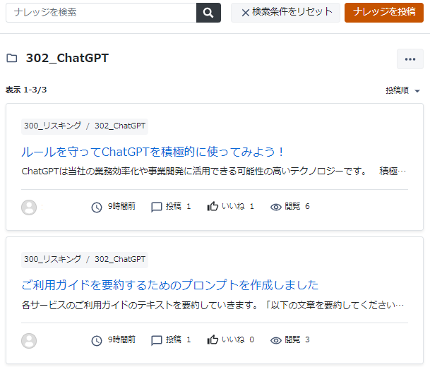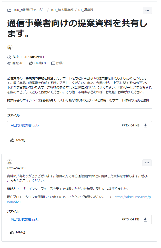 •投稿されたナレッジにコメント、「いいね」することができる。(資料や画像も添付可能)