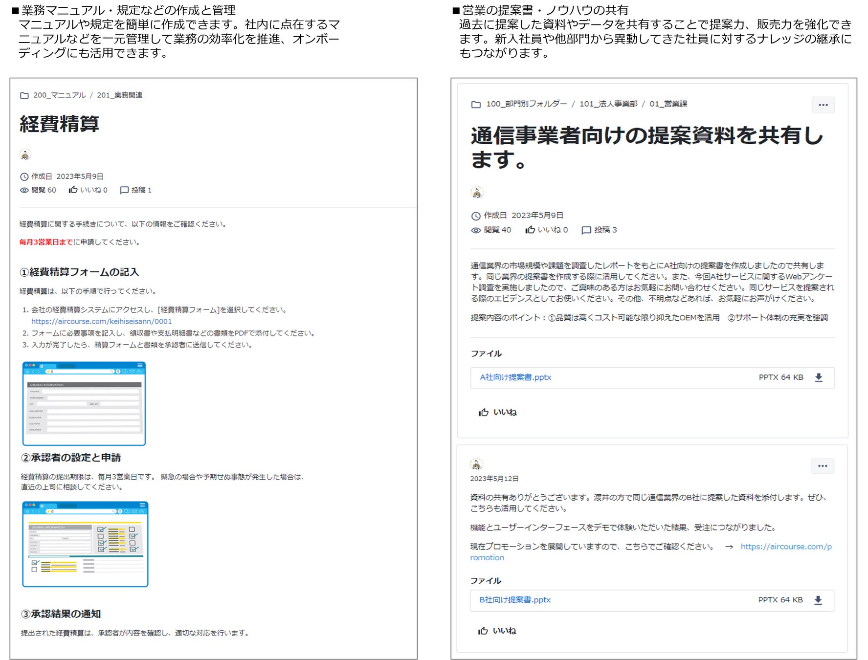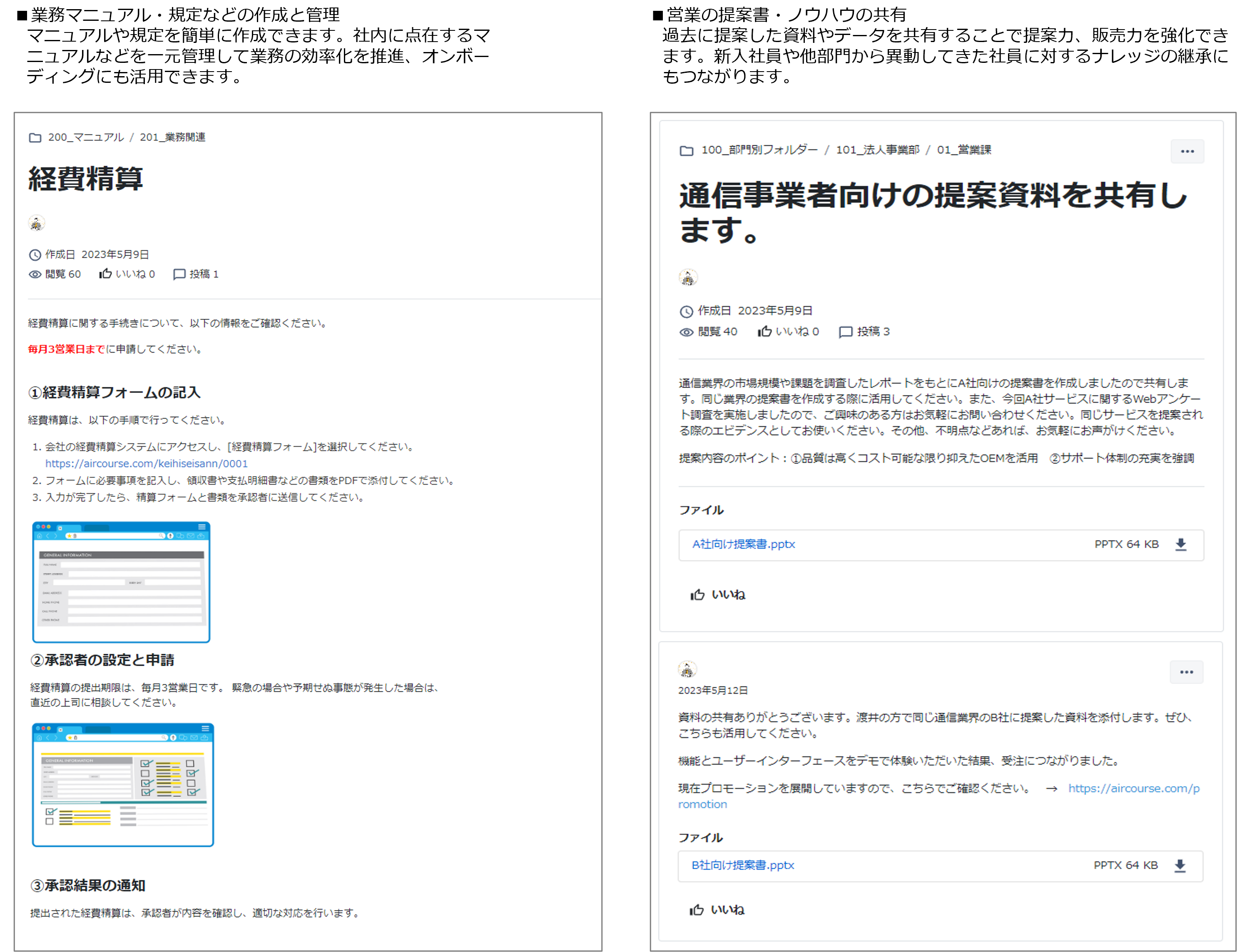 「AirCourseナレッジ」は、社員のナレッジをクラウド上で可視化・共有および継承することができます。また、社員同士の双方向の学びによるリスキリングの強化、エンゲージメントの向上や新しいアイデアの創出が期待できます。さらに、マニュアルや規定等の一元管理による組織全体の生産性向上、営業の提案資料やマーケティング施策の成功事例等の共有により、売上拡大を目指すこともできます。